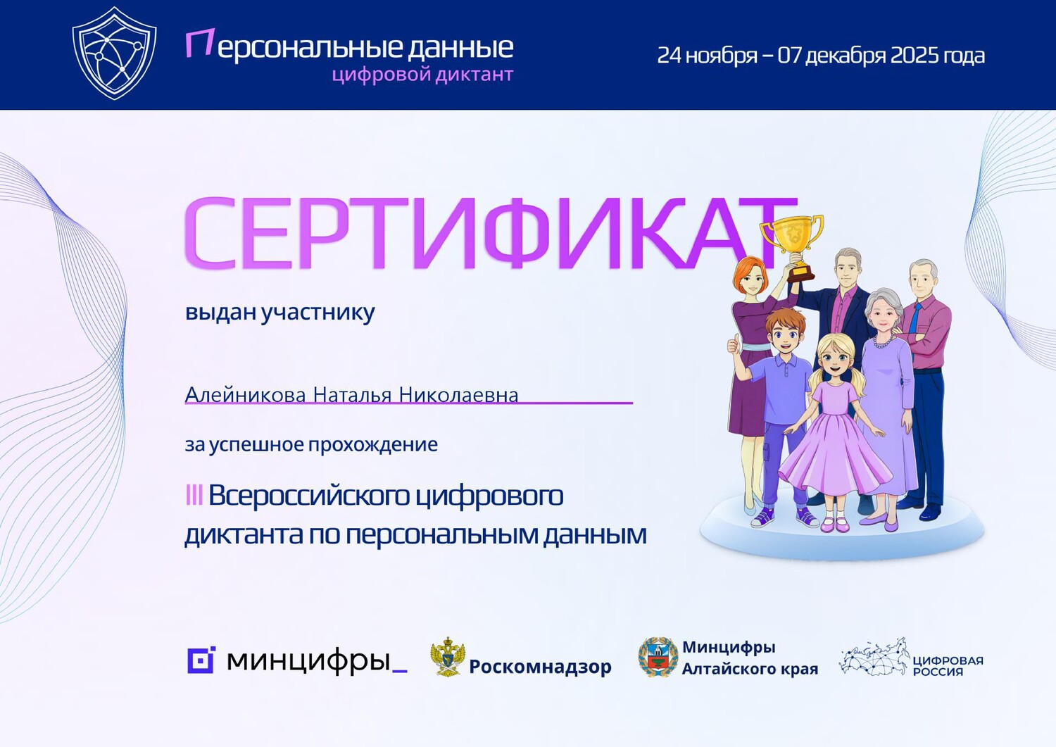 С 24 ноября по 7 декабря 2025 года Министерством цифры Алтайского края при поддержке Министерства цифрового развития, связи и массовых коммуникаций Российской Федерации, в рамках проекта «Цифровая Россия» партии «Единая Россия», организовано проведение III Всероссийского цифрового диктанта по персональным данным. Целью проведения Цифрового диктанта является повышение уровня цифровой грамотности широкого круга лиц в области безопасности персональных данных. Проект проводится с 2021 года и включен в каталог лучших практик АНО «Цифровая экономика» по цифровой грамотности и кибергигиене. В диктанте от нашей школы приняли участие 25 человек 10-11 классов. | |